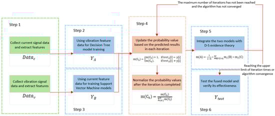 Among them, pred_A is the prediction result of algorithm A, pred_B is the prediction result of algorithm B, probability_values_A is the probability value of algorithm A, and probability_values_B is the probability value of algorithm B. Algorithm A refers to the support vector machine algorithm based on current signals, and algorithm B refers to the decision tree algorithm based on vibration signals. Lines 3 to 5 initialize the number of categories, the basic probability distribution matrix, and the degree of conflict. Line 6 and line 7 calculate the basic distribution probability. From line 8 to line 14, the conflict degree K is calculated. From line 15 to line 21, the combination probability value is calculated. The 22nd and 23rd behaviors are normalized. The 24th behavior selects the category with the highest probability value.