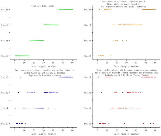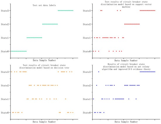 The specific experimental results are shown in Figure 4. Among them, green represents the test dataset labels, red represents the classification results of the support vector machine, orange represents the classification results of the decision tree, blue represents the classification results of the ant colony algorithm improves D-S evidence theory method, and blue represents the classification results of the ant colony algorithm improves D-S evidence theory method.