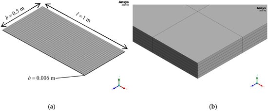 During the simulation, a curved deformed state of the plate was observed realized for the first time (Figure 3). The temperature field was not recorded. Due to the initial deflection, free- plate vibrations occurred. When the plate reached a flat state, after several perfect vibrations, a heat flux of 1400 W/m2 was instantly applied. At this point, the temperature field of the plate was considered uniform. At the same time, one boundary surface of the plate was exposed to heat flow, and it radiated heat into the surrounding space according to the Stefan–-Boltzmann law [42]. The other boundary surface only radiated. The initial data for the simulation areis presented in Table 1.