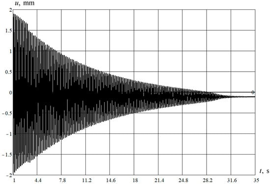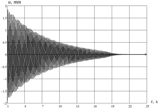 The vibration frequency range (4.712–4.721 Hz) is small and depends on the choice of the mesh. It can be assumed that the vibration frequency is constant and corresponds to a value of 4882 ± 0.1 Hz. The amplitude decreases from the initial deflection value of 2 mm to about 0.005 mm in 20 s of vibration. This is due to the dissipation of vibration energy due to internal friction.