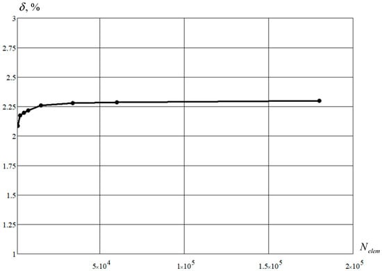 Calculations using Formula (1) show that the theoretical vibration frequency is approximately 4.822 Hz. Figure 4 shows the error of the calculated frequency relative to the theoretical one. As the number of elements increases, this error increases slightly due to an increase in the rounding error [50]. In general, it does not exceed 2.3%. This indicates good convergence.