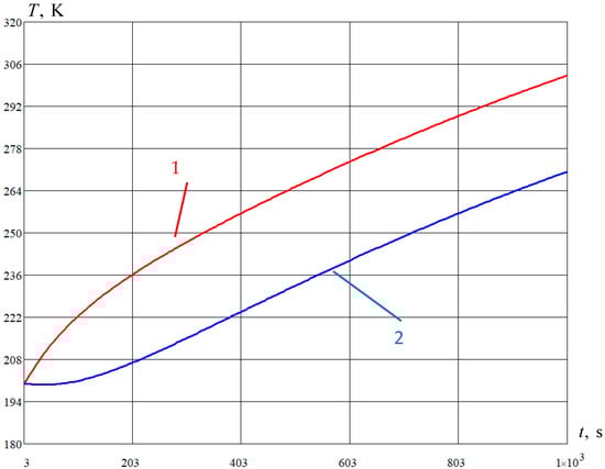 It is evident from Figure 5 that the surface layer, onto which the flux falls, begins to heat up immediately after the onset of the temperature shock. During heating, radiation from the surface layer is considered according to the Stefan–Boltzmann law [41]. This is precisely why a decrease in the rate of heating is observed. This is expressed in the bend of curve 1 in Figure 5. Much more complex temperature dynamics are observed on the shadow surface layer of the plate. At first, it cools down due to the fact that the initial temperature of the layer is higher than the ambient temperature. The heat flux from the heated layer has not yet reached the shadow surface layer. Therefore, it cools down for some time after the onset of the temperature shock. Then, the sign of the temperature derivative changes due to the fact that, due to thermal conductivity, the heat flux from the heated layer reaches the shadow surface layer. The temperature of the layer begins to rise. At first, this growth is accelerated (this is expressed in the upward-bent branches of nonlinear dependence 2 in Figure 5 in the corresponding section). However, the heat flux from the heated surface layer weakens. This happens because the external heat flux is considered constant (1400 W/m2), and the radiated flux increases with increasing surface layer temperature. This leads to a change in the sign of the second derivative of the temperature. The growth becomes slow (the branches of dependence 2 in Figure 5 bend downwards). Over the 1000 s of heating considered, the plate is far from a state of thermodynamic equilibrium. However, the temperature gradient along the plate thickness levels out and remains almost constant for a long period of time.