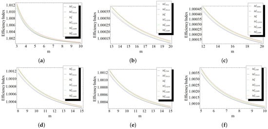 Plots for efficiency index values for the following: (a) versus , , , , ; (b) versus , , , , ; (c) versus , , , , ; (d) versus , , , , ; (e) versus , , , , ; (f) versus , , , , .
