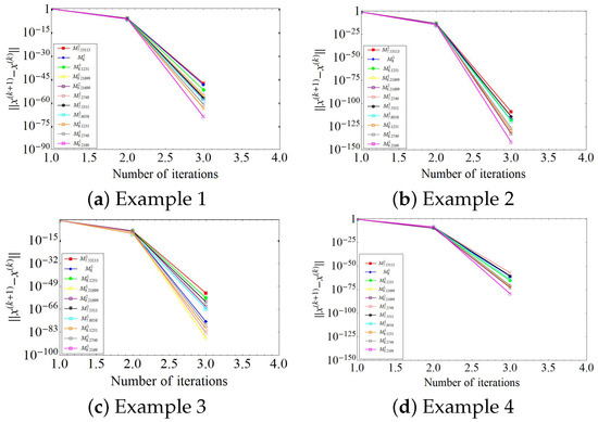 Figure 2 provides a graphical representation of the errors at each consecutive iteration for the different iterative processes employed to solve Examples 1–4. The figure highlights the superior performance of our proposed method (15)–(17) compared to other well-known methods. Specifically, it shows that our method converges more rapidly and achieves significantly higher computational accuracy across all examples.