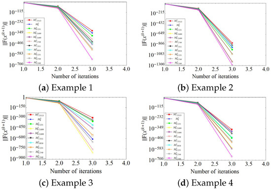 Furthermore, Figure 3 depicts the function values at each iteration for Examples 1–4. These results reaffirm the effectiveness of our approach in achieving consistent and accurate solutions while maintaining stability in the iterative process. The function values obtained using our method exhibit a faster decrease to zero (or the desired tolerance), which is a direct indicator of superior convergence characteristics.