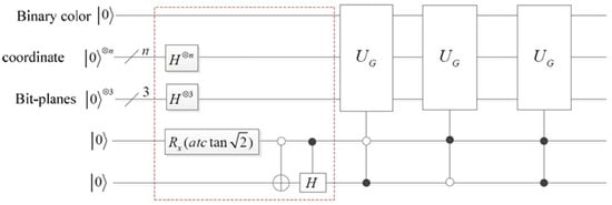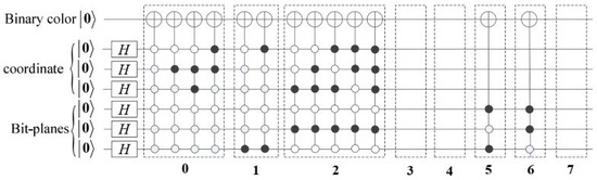 In this context, and represent the n-fold tensor products of the spaces and , respectively. The circuit depicted within the dashed box corresponding to bit-plane j (where j = 0, 1…, 7) is responsible for storing the j-th bit-plane in quantum systems. Consequently, the circuit , illustrated in Figure 4, is executed.