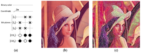 Both steganography and cryptography are crucial for information security, yet they serve different functions. Cryptography focuses on obscuring the content of information, ensuring that even if the message is intercepted, it remains unreadable to unauthorized parties. In contrast, steganography aims to hide the existence of the information by embedding it within seemingly innocuous carriers such as images, audio files, or text, making it difficult to detect. Cryptography encrypts messages using algorithms and keys, transforming them into unreadable formats. Despite this, encrypted messages can sometimes reveal signs of their encrypted nature, suggesting the presence of concealed information. Steganography, however, hides the message within a cover medium, such as an image or audio file, without leaving visible traces to those not aware of the technique. For instance, if sensitive data needed to be transmitted securely, cryptography would encrypt the message, resulting in a secure but visibly encrypted output that indicates the presence of sensitive information. Steganography, on the other hand, would embed the message within a harmless image or audio file, making the hidden information nearly impossible to detect without knowledge of the steganographic method [1,2,3,4,5,6]. In encryption, two primary methodologies are utilized: scrambling and replacement. Scrambling involves disrupting the pixel arrangement of the original image using algorithms such as Arnold, Fibonacci, and Hilbert [7,8,9,10,11]. Replacement, on the other hand, focuses on altering pixel values, thereby modifying the statistical properties of the encrypted image. Both methods are crucial for ensuring secure data transmission. In the realm of quantum image processing, preserving information security is of utmost importance. The spatial domain of a quantum image encompasses two key attributes: pixel position and color information [12]. Quantum image representation has advanced over time, with lattice-based qubit representations becoming common. One notable technique is the quantum image representation based on bit-planes, which has garnered attention due to its benefits in encryption and image processing. Several factors contribute to the focus on encryption and image processing within quantum image processing, including the impressive capabilities of quantum coherent states, entanglement, and superposition. These factors significantly enhance the encryption process and boost quantum storage capacity. For an image with a “22n” pixel configuration, such as “2n × 2n”, fewer qubits are required compared to other representations. These include Normal Arbitrary Superposition State (NASS), Flexible Representation of Quantum Images (FRQI), Multi-Channel Quantum Images (MCQI), Quantum Multi-Channel Representation (QMCR), generalized NEQR (GNEQR), and Novel Enhanced Quantum Representation (NEQR). Quantum image processing offers several advantages over classical methods. For instance, quantum Fourier transform and Quantum Discrete Cosine Transform provide enhanced efficiency. Image processing and encryption operations can be simulated on classical computers using linear algebra, complex vectors, and unitary matrices. Quantum states are often described by probability distributions rather than individual states, with measurements producing probability distributions as output. The normalized quantum state of an image captures both color and pixel position, enabling image storage and processing through quantum Fourier transforms for binary images. Feynman’s computational model introduced the concept of quantum image representation through quantum computers. The FRQI model, for instance, provides a quantum representation for images with a specific number of qubits required for grayscale images. Two-dimensional arrays of qubits represent quantum images, illustrating quantum entanglement states. The MCQI model offers a standardized quantum representation for color images of size 2n × 2n with a minimal qubit requirement of 2n + 3. Compared to FRQI, MCQI is more efficient for image processing, storage, and encryption. It supports watermarking algorithms for color images, whereas FRQI is limited to grayscale images. Encoding a 64 × 64 color image in classical systems requires 12,288 bits, but the MCQI model achieves encryption with just 15 qubits, reducing computational complexity and resource usage. Additionally, MCQI enables simultaneous color image data processing with three qubits, simplifying processing and ensuring consistent color handling across the entire image. The NASS quantum image representation allows for processing both color and grayscale images using 2n quantum qubits for a 22n pixel image, with each qubit representing a single bit of image data. The NEQR model enhances the FRQI model by processing and storing individual pixels using qubits in their base state rather than amplitude. It achieves faster quantum image processing by a factor of two and offers a compression rate up to 1.5 times higher than FRQI while preserving image recovery accuracy. This model provides greater flexibility and simplifies complex pixel color analysis. The Quantum Multi-Channel Representation (QMCR) model introduces a new method for representing color images in quantum computing. QMCR uses two entangled qubit sequences to separately encode color data and pixel locations, improving data representation fidelity. It requires 2n + 24 qubits for a 2n × 2n color image, highlighting its enhanced capabilities and finer resolution in quantum environments. The Bit-Plane Representation of Quantum Images (BRQI) has significantly increased storage capacity, with grayscale images benefiting from a factor of “24” and color images from a factor of “218”. Color images, consisting of three-color channels with eight binary bits each, can be decomposed into 24 binary images, known as bit-planes. This information is detailed in Table 1, which al