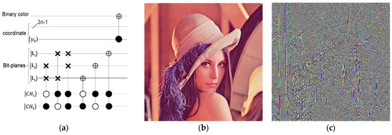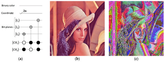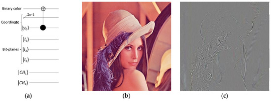 The process of transferring image bit-planes. (a) The circuit design of . (b) A color image with dimensions of 256 × 256. (c) The outcome of the image bit-planes transfer process.