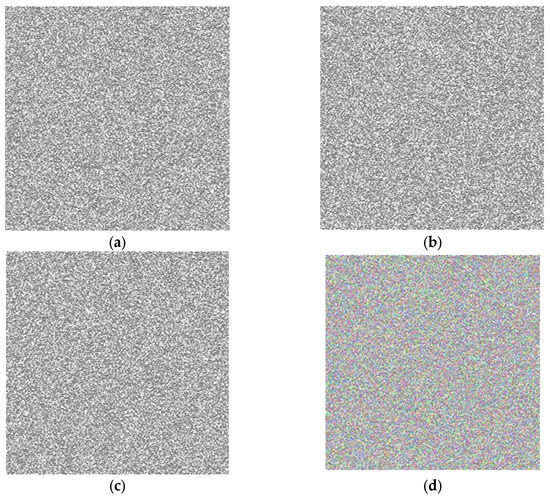 The key image is formed by utilizing the logistic map equation as its foundation. It comprises four distinct components: (a) the image in the red channel, (b) the image in the green channel, (c) the image in the blue channel, and (d) the outcome of the second stage encryption, which is referred to as the key image.