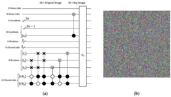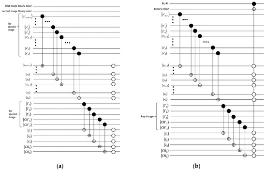 (a) A quantum comparator circuit for two images of size () utilizing BRQI. (b) A quantum comparator circuit incorporating the Binary XOR (exclusive OR) operation for the key image and the image encrypted by the initial phase algorithm.