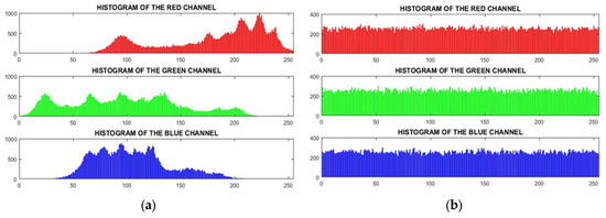 Analyzing the histogram of the algorithm reveals that a smoother peak distribution and a flatter alignment indicate a more effective and efficient image-scrambling process. This is evident in Figure 17, where the histogram of the Lena image is examined. Figure 17a shows the irregular histogram of each color channel in the Lena image before encryption, while Figure 17b depicts the transformation into a smoother and more uniform histogram after encryption using the proposed algorithm.