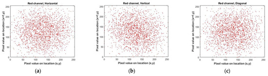 Correlation distributions of Lena’s image in each direction. (a–c) for the red color channel. (d–f) for the green color channel. (g–i) for the blue color channel.
