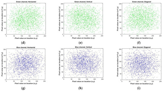 Correlation distributions of the encrypted Lena image in each direction. (a–c) for the red color channel. (d–f) for the green color channel. (g–i) for the blue color channel.