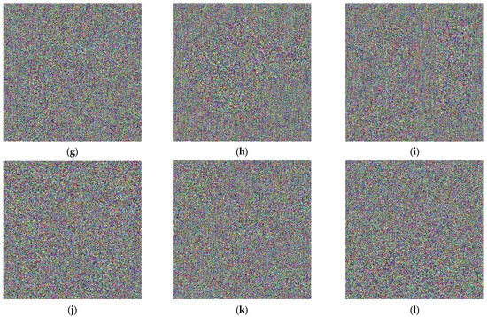 Multiple images prior to and following the encryption process: (a) Lena; (b) Image-1; (c) Image-2; (d) Image-3; (e) Image-4; (f) Image-5; (g) encrypted Lena; (h) encrypted Image-1; (i) encrypted Image-2; (j) encrypted Image-3; (k) encrypted Image-4; (l) encrypted Image-5.