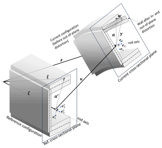 where , is the director vector that maps the cross-sectional points w.r.t to the cross-sectional origin and is the axial reference position, both in the reference configuration. The current configuration is obtained by the composition of a cross-sectional rigid body motion (axial displacement and cross-sectional rotation tensor ) and a warping , rendering