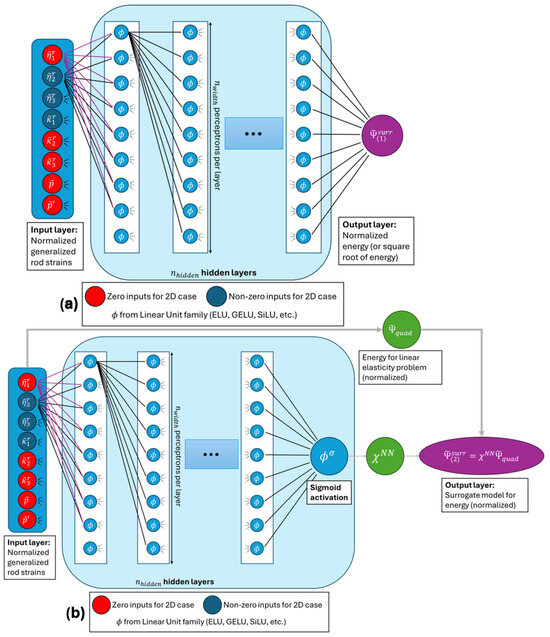 Figure 2. Proposed DNN architectures and properties for the current application, for (a) and (b) . - Estimation of a multiplicative function that ponderates the linear elastic solution, i.e., the quadratic function , where is a function, made of densely connected linear layers and activation function from the linear unit family (ELU, ReLU, GELU, SILU, etc.) and a final logistic sigmoid activation layer and , with the tangent stiffness for rods (as in [11] or [15], for example), see Figure 2b.