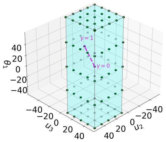 - setting upper and lower boundaries for each entry of , creating a hypercubic domain for the study, see Figure 4;