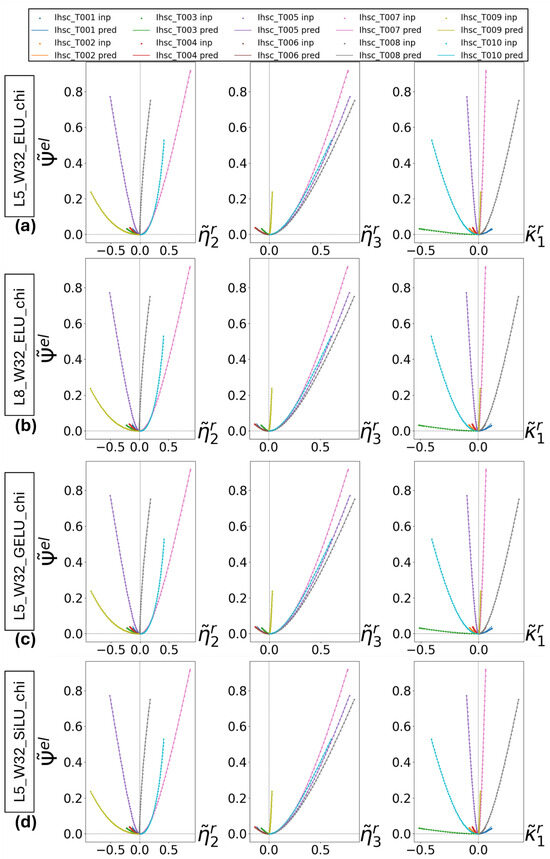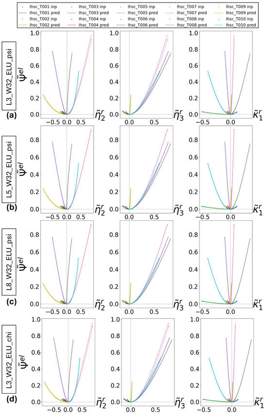 Prevision of test subset T001-T010, using model (a) L3_W32_ELU_psi, (b) L5_W32_ELU_psi, (c) L8_W32_ELU_psi, (d) L3_W32_ELU_chi. Dots are input data and lines are previsions.