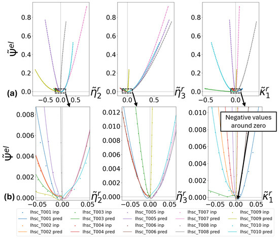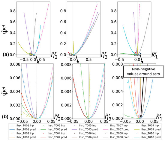 However, around zero strains, models using failed to comply with the non-negativity constraint, see Figure 10. For those, several regularization strategies (that are not reported here) were tested unsuccessfully. In light of the discussion from Section 3.1, the remedy was to use the alternative strategy . Only then we were able to consistently generate models that predict well both large and small strain energy functions, while complying to the conditions mentioned above, see Figure 11. Therefore, from now on, the discussion will only consider surrogate models derived from approach.