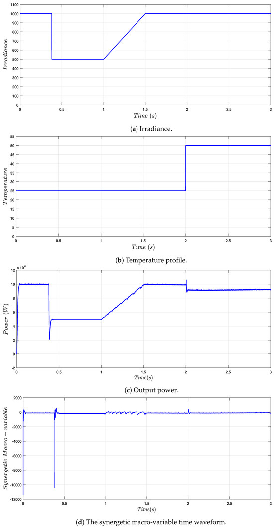 This part presents the outcomes of the simulation experiments, which were designed to evaluate the performance of the proposed MPPT synergetic controller system under different scenarios. Experiments were designed to test various scenarios and parameters to understand their impact on the system’s performance. The results are categorized and discussed in detail to highlight key findings and trends. The aims through these simulations were to provide a comprehensive evaluation of the proposed MPPT synergetic controller, as shown in Figure 1, under different conditions, thereby offering insights into its robustness, efficiency, and potential areas for improvement.