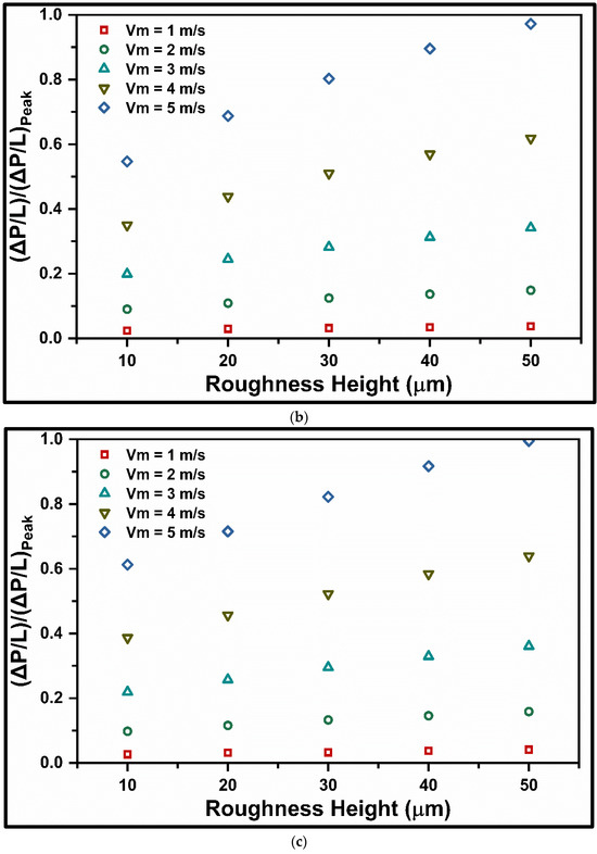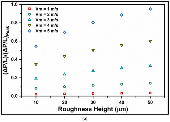- The normalized pressure gradient positively correlates with roughness height, which further varies with Vm: minimal at low Vm but increasing exponentially at higher Vm. Additionally, for a given Vm and roughness height, the pressure gradient increases proportionally with Cw.