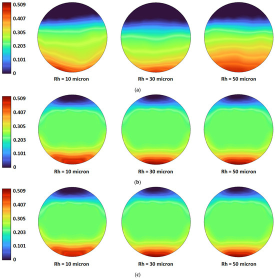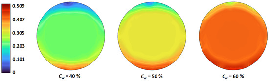- The surface roughness significantly affects particle concentration distribution at lower velocities, with roughness-induced gradients diminishing as Vm increases due to stronger inertial effects. Additionally, higher Cw results in a more uniform yet denser particle distribution across the pipe cross-section.