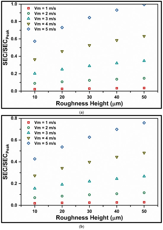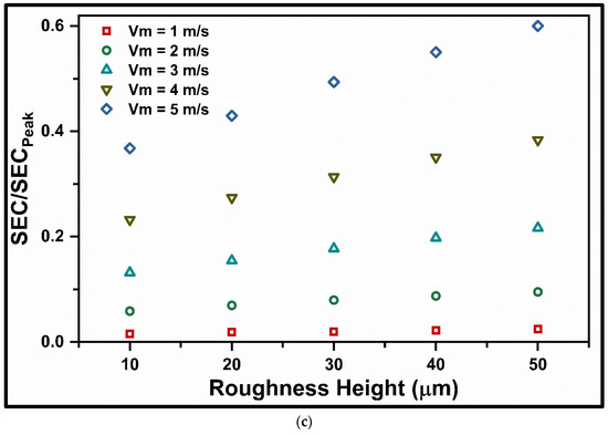 - Similarly to the pressure gradient, normalized Specific Energy Consumption (SEC) also rises with roughness height, Vm, and Cw, following a comparable trend.