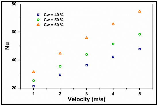 - The non-dimensional Nusselt number remains independent of roughness height yet is significantly influenced by Vm and Cw. A lower Vm corresponds to reduced Nusselt numbers, which increase with arh rise in Vm and Cw. The maximum Nusselt number is observed at Cw = 60%.