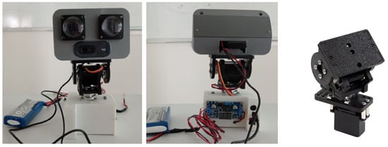 - Hardware: This layer interfaces with the PTU and the webcam, both of which are part of the robot’s head, to capture the visual information and the angular position of the PTU in the x-y axes. The robot head (Figure 2) is a 3D-printed box with ABS material, containing the webcam, the PTU (Figure 2), and two servo motors. Additionally, it has two LED screens that display the animation of two human eyes. The Logitech C270 HD webcam, mounted on a pan–tilt unit, has a resolution of 1280 × 720 pixels and captures visual information at a maximum rate of 30 frames per second (FPS). The PTU was interfaced with a high-performance 32-bit ARM core Arduino Due microcontroller IT. The range of motion of the PTU is 180 degrees in the x-axis and 130 degrees in the y-axis. The servomotors used to drive the PTU are RDS5160 SSG, capable of a maximum torque of 7 Nm, with each motor powered by 8.4 V and 2.5 A.