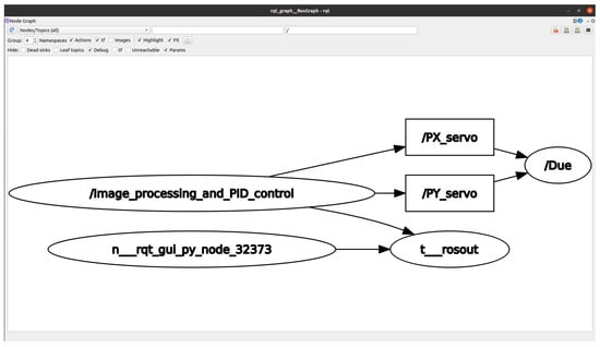 - Software: An image processing module was implemented to receive an RGB image, segment the object of interest using a color filter, smooth the image with a 3 × 3 Gaussian filter, and calculate the centroid of the bounding box surrounding the segmented object. OpenCV libraries were employed for image processing task [33]. To effectively segment objects with composite colors, such as the body of a pineapple, a multivariate Gaussian filter (MGF) was developed and trained to detect the pineapple, excluding the crown. The MGF parameters were optimized with a genetic algorithm. The position (x, y) of the centroid of the segmented object in the image plane is published. Subsequently, the PID control evaluates whether the received coordinates match the center of the image plane. If they do not align, the control action is executed on the pan–tilt unit to adjust the position of the webcam and track the object. The graph generated in ROS2 is shown in Figure 4, which includes a node responsible for processing the images, sending the output of the PID controller in the form of coordinates (x, y), and another node that communicates with the Arduino Due board through microROS and receives the data and sends control signals to move the servomotors.