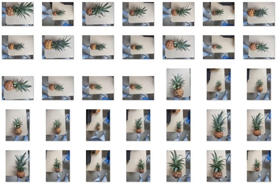 The elements of and , as shown in (3) and (4), respectively, are optimized using a GA. The range of values of each element in is , corresponding to the intensity value for a pixel in each color channel. Binary individuals are used to optimize and parameters with the GA. Each element of is represented by 8 bits, while 13 bits are used to represent each component of , corresponding to the range [0, 8191], which was found to be sufficient based on the conducted experiments. Consequently, each individual consists of 102 alleles, distributed as follows: 8 bits for each value of , , and ; and 13 for each value of , , , , , . For this work, 35 photos of pineapples were captured (Figure 5), with the background containing various colors and shapes.
