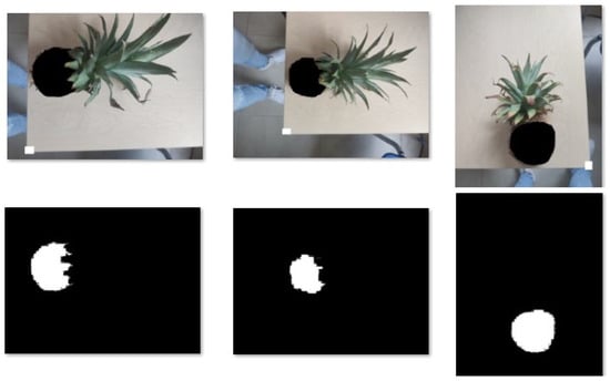 The binary images serve as reference images. These images are used to assess the fitness of each individual in the GA for segmenting the body of the pineapple. With the GA, each pixel of the images Figure 5 is evaluated with Equation (2). The resulting segmented image is then compared with the corresponding reference image to calculate the confusion matrix and determine the proportion of pixels correctly classified as 255 (pineapple body) and 0 (rest of the image). The percentage of correctly classified pixels indicates the fitness of each individual.