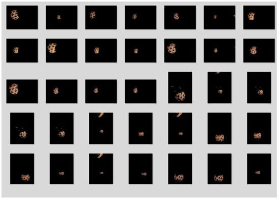 Following Algorithm 1, a random population of 100 individuals was created. To optimize the and , the 35 pineapple images shown in Figure 5 were used. For each image, the pineapple was manually colored black, and Figure 6 shows 3 of the 35 images, where the body of the pineapple is manually colored black. Then, using MATLAB R2022a, a binary image is created, where the black pixels in the top row are changed to white, and the remaining pixels are assigned the intensity of the black color.