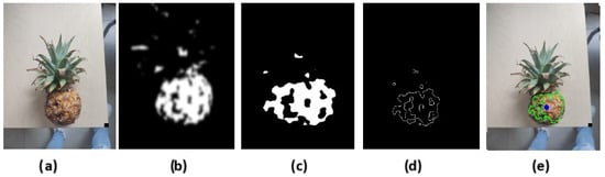 To calculate the centroid of the segmented pineapple, a smoothing filter is applied to remove noise for contour detection, and the centroid of the bounding box of the largest contour is obtained (Figure 8).