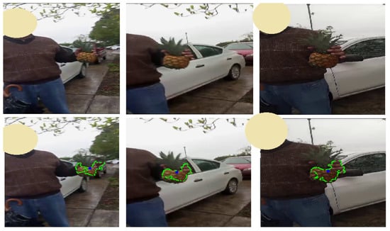 To evaluate the robustness of the MGF trained with images of pineapple captured indoors, images taken in an outdoor environment (Figure 9) were analyzed. In the lower images, the segmented pineapple is highlighted with a green outline. However, it can be observed that the hand of the person holding the pineapple was also identified within the pixel outline that corresponds to the body of the pineapple.