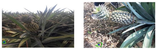 Images of pineapples with green hues captured in an outdoor environment [35]. The green outline indicates the segmentation of a pineapple, which is an incorrect detection.