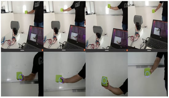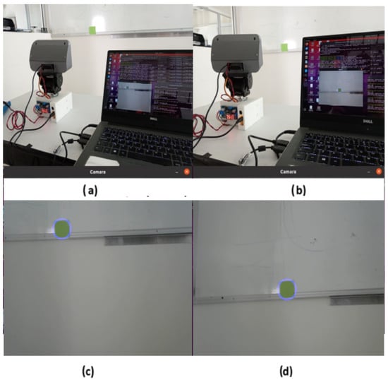 Subsequently, the response of the PID controller to track a moving green object is evaluated. In this experiment, the centroid of the object in the image plane changes as the green object is moved in different directions. Figure 15 shows a sequence of various movements and demonstrates how the PTU follows the green object, attempting to keep it centered in the image plane. In the following link https://n9.cl/00qv56 (accessed on 30 September 2024), videos with the robot head tracking were uploaded.