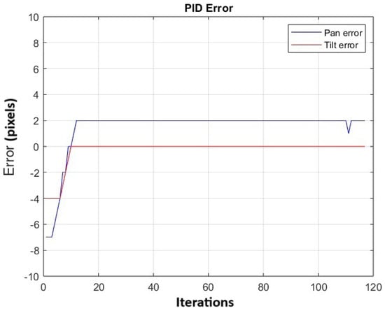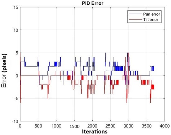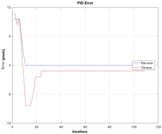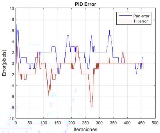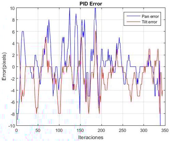 The performance of the controller was evaluated using the gains Kp = 0.7, Ki = 0.2, and Kd = 0.01, which were were obtained in [28] through the manual adjustment of the controller. The experiment was repeated 20 times. Figure 17 shows the variation in the average error for both the pan and tilt in the 20 repetitions. Peaks are observed along the trajectory, which correspond to instances when the object is moved to various positions. Additionally, the average absolute error in panning is 2.64 pixels and in tilting is 2.32 pixels.