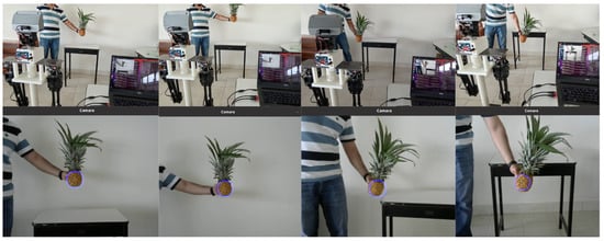 Second, the response of the PID controller to track a moving pineapple is evaluated. In this experiment, the centroid of the object in the image plane changes as the pineapple is moved in different directions. Figure 20 shows a sequence of various movements and how the PTU follows the pineapple, trying to keep it in the center of the image plane. In the following link https://n9.cl/00qv56 (accessed on 30 September 2024), videos with the robot head tracking were uploaded.