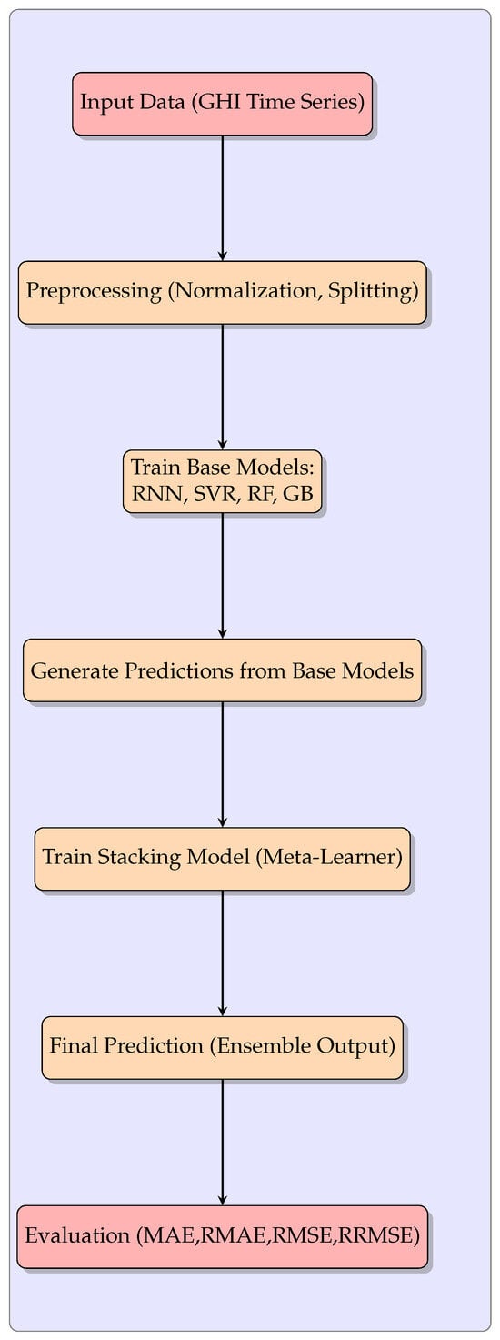 Figure 1 shows the Stacking Ensemble approach for short-term Global Horizontal Irradiance (GHI) predictions. The process involves preprocessing, training base models (RNN, SVR, RF, GB), generating predictions, training a meta-learner, and evaluating the final ensemble output. A detailed discussion of the methods is given as follows.