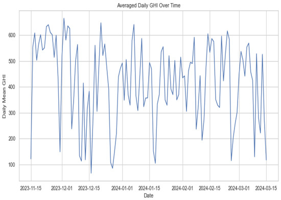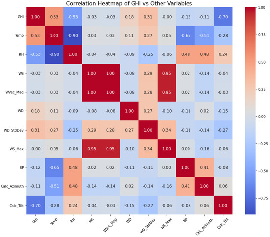 In our data preprocessing, we focused on cleaning the dataset to ensure its accuracy and reliability. One challenge we encountered was the presence of zero values in the GHI variable, which measures the total amount of shortwave radiation received from above by a horizontal surface. Since data were collected over 24 h, zero values were recorded during nighttime when there was no sunlight. To address this issue, we used listwise deletion to remove all the zero values based on GHI. This ensures that our study is robust. Imputation techniques were not considered, as simply replacing with a mean can introduce bias, as GHI depends on specific factors. Since GHI rises in the morning and peaks during the day, replacing it with mean or other values would reduce the quality of the study.