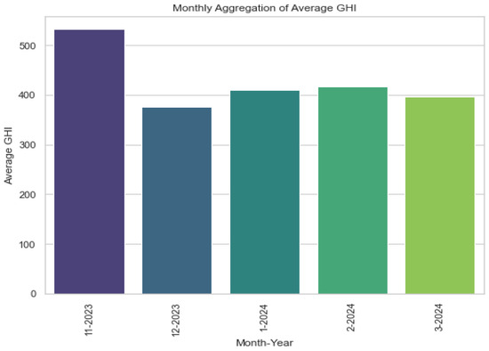 Figure 2, Figure 3, Figure 4 and Figure 5 represent the GHI at different times, including the overall time, average daily aggregation, monthly aggregation, and by the hour. These plots allow us to observe the behaviour of GHI at different times. Figure 2 shows how GHI behaves minute by minute throughout the data, while Figure 3 displays the average daily GHI behaviour. Figure 5 summarises the GHI over different months covered by the data, revealing the highest GHI in the eleventh month of 2023. Lastly, Figure 4 illustrates the behaviour of GHI over hours, confirming that GHI is lowest during late hours and peaks during mid-hours of the data. These plots offer a comprehensive understanding of GHI trends across different time frames.
