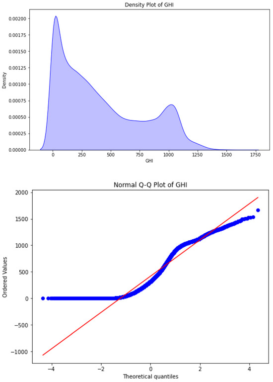 Figure 6 displays the density and Q-Q plots, confirming the earlier EDA findings. The density plot indicates a right-skewed distribution, with most GHI values between 0 and 200 and fewer high values above 1000. The Q-Q plot further illustrates that the GHI data deviate from normality, showing significant skewness and potential outliers, reinforcing that the data do not follow a normal distribution.