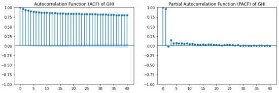 Figure 8 below displays the Autocorrelation Function (ACF) and the Partial Autocorrelation Function (PACF) plot for GHI. The ACF plot shows a slow, gradual decay in correlation, indicating that the time series is non-stationary and has long-term dependencies or trends. The strong correlations at multiple lags suggest that GHI values over time are highly persistent. On the other hand, the PACF plot shows a sharp cutoff after lag 1, suggesting that after accounting for the first lag, the correlations with subsequent lags are negligible.