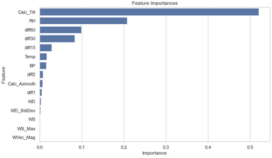The datasets span from 15 November 2023 at 15:58:00 to 15 March 2024 at 22:32:00. The data are minute-averaged with 99941 observations. The variables in the data include GHI (the response variable), Temperature, Relative Humidity, Wind Speed, the wind speed vector magnitude, Wind Direction, Wind Direction Standard Deviation, Wind Speed Maximum, Barometer Pressure, Calculated Azimuth Angle, Calc Tilt Angle, and five derived variables (diff1 to diff60 which are variables created that represent temporal differences in GHI values over different time intervals, capturing short-term variations in solar radiation). All these variables will help to predict the response variable, and their ranges can be seen in Table 1. The table’s symbols represent the following measurement units: °C for degrees Celsius, % for percentage, m/s for meters per second, ° for degrees, and hPa for hectopascals.