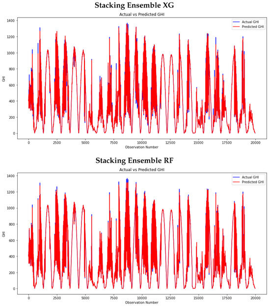 When evaluating the performance of the Stacking Ensemble models, it was important to use the same parameters selected during the individual models’ training. Four meta-models were used: Ridge regression, XGBOOST, RF, and Elastic Net. Out of these, the two best meta-models, RF and XGboost, were further explored to understand the impact of the meta-model in the Stacking Ensemble setting. The results showed that both Stacking Ensemble models with these meta-models outperformed all other machine learning models. The best stacking model was the one with XGboost as the meta-model, showing a 67.060% and 22.2848% increase in accuracy compared to the MAE and RMSE of the best-performing machine learning model, RNN.