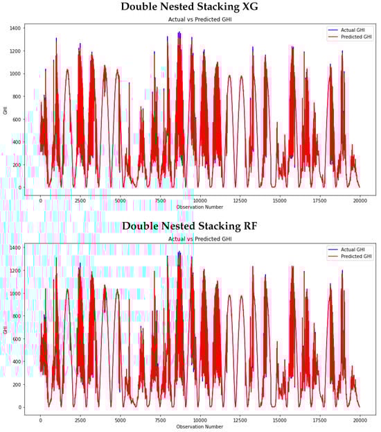 In today’s world, where sustainable energy is essential for the planet’s survival, accurate solar energy forecasting is crucial. This study focused on predicting short-term Global Horizontal Irradiance (GHI) using minute-averaged data from the Southern African Universities Radiometric Network (SAURAN) at the Univen Radiometric Station in South Africa. Various techniques were evaluated for their predictive accuracy, including Recurrent Neural Networks (RNNs), Support Vector Regression (SVR), Gradient Boosting (GB), Random Forest (RF), Stacking Ensemble, and Double Nested Stacking (DNS). The results indicated that RNN performed the best in terms of mean absolute error (MAE) and root mean squared error (RMSE) among the machine learning models. However, Stacking Ensemble with XGBoost as the meta-model outperformed all individual models, improving accuracy by 67.06% in MAE and 22.28% in RMSE. DNS further enhanced accuracy, achieving a 93.05% reduction in MAE and an 88.54% reduction in RMSE compared to the best machine learning model, as well as a 78.89% decrease in MAE and an 85.27% decrease in RMSE compared to the best single stacking model. Furthermore, experimenting with the order of the DNS meta-model revealed that using RF as the first-level meta-model followed by XGBoost yielded the highest accuracy, showing a 47.39% decrease in MAE and a 61.35% decrease in RMSE compared to DNS with RF at both levels. These findings underscore advanced stacking techniques’ potential to improve GHI forecasting significantly.