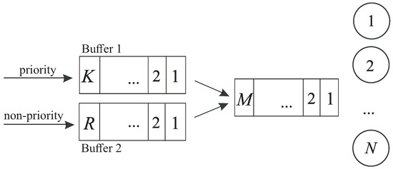 We consider the queueing system that consists of a service device with N identical servers, the finite main buffer of capacity and two input buffers: Buffer 1 and Buffer 2. The capacity of Buffer 1 is equal to K and the capacity of Buffer 2 is equal to . Figure 1 depicts this queueing system’s topology.