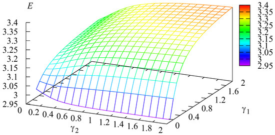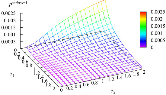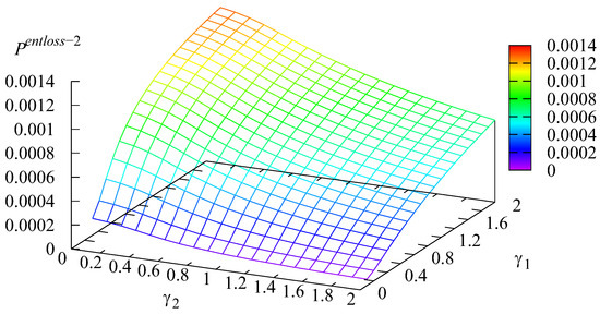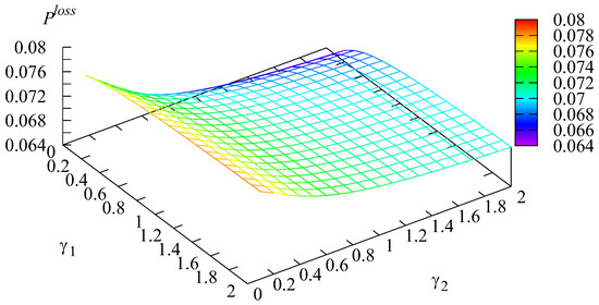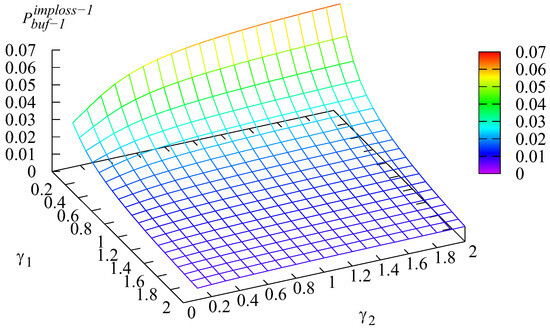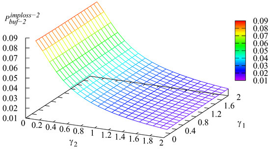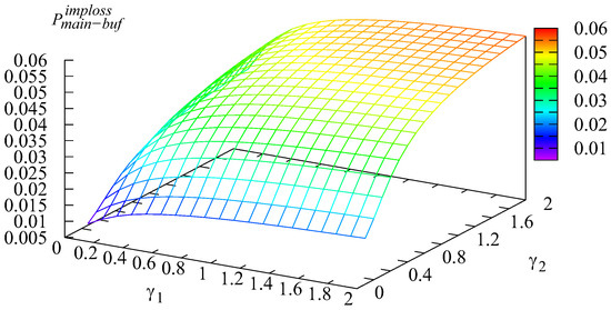 It is evident from Figure 6 that the probability of loss of an arbitrary customer from the main buffer due to impatience is minimal when both intensities and are small and quickly increases with the growth of these intensities. This is easily explained by the smaller probability of a customer loss in the corresponding input buffer when the transition rate is high. If more customers are not lost in the input buffers, more customers attend the main buffer, which increases the likelihood that a customer from this buffer will be lost due to impatience.