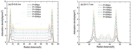 The radial distribution function (RDF) in the pore size of D = 5.6, 1.7, 1.1, and 0.5 nm at a pressure of 5–30 MPa is shown in Figure 7. An accumulation layer of methane molecules can be clearly seen near the inner wall of the slit. The methane molecules in the central region are randomly distributed, and the fluctuation in adsorption density is marginal. Two adsorption layers can be clearly seen in Figure 7a,b. When the pore size is comparable to the gas molecule size, the repulsion between the pore wall and the gas molecules dominates the adsorption process. Thus, the second adsorption layer disappears in Figure 7c and the gas adsorption density is much lower than that in Figure 7a,b. With the further reduction in pore size (D = 0.5 nm in Figure 7d), the adsorption potentials of the two walls are superimposed on each other and the peak value of the adsorption gas density is much higher than that in Figure 7a–c. It can be found from Figure 7 that the gas density increases as the pressure increases. The position of the second adsorption layer depends on the pore size, while the pressure only affects the peak value of gas density.